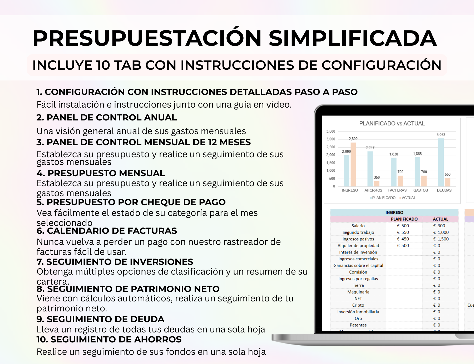 • PRESUPUESTO MENSUAL (12 PESTAÑAS) – Planifica tu presupuesto y registra todas las transacciones financieras, incluidos ingresos, facturas, gastos, ahorros, inversiones y deudas